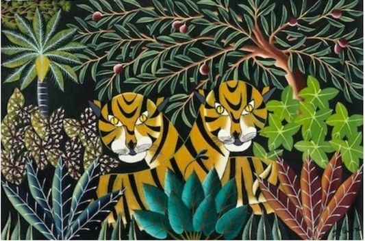 Haitian artist Carlo Desrosiers, born in Haiti, paints jungle scenes in a primitive style.
