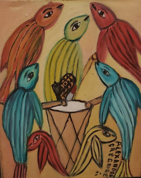 Alexandre Gregoire (1922-2001) 10"x8" Musician Birds Oil on Canvas Unframed Painting #1MF