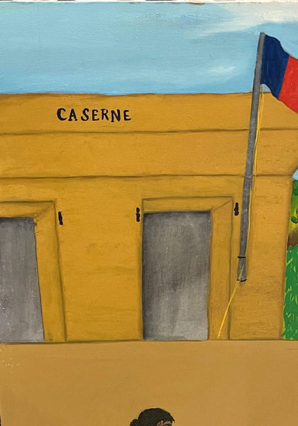 This painting is a vintage historical piece signed by the late Haitian painter from Cap-Haitian Jn-Baptiste Jean dated in 1973. The famous Battle of Vertieres was the last major battle of the Haitian Revolution, and the final part of the revolution under Jean-Jacques Dessalines. It was fought on November 18, 1803, between the Haitian indigenous army, and Napoleon's French expeditionary forces, who were committed to regaining control of the Island. It is sold unframed. It is signed with the inscription on the lower center: "Pétion, Christophe, Garat, Gerin, Capois, Vernet, Marie Jeanne see reunirent chez Dessalines pour entendre le plan de la bataille du 18 Novembre 1803 et aujourd'hui c'est 17 Nov 1803", meaning Pétion, Christophe, Garat, Gerin, Capois, Vernet, Marie Jeanne see met at Dessalines to hear the plan of the battle of November 18, 1803 and today is Nov 17, 1803.