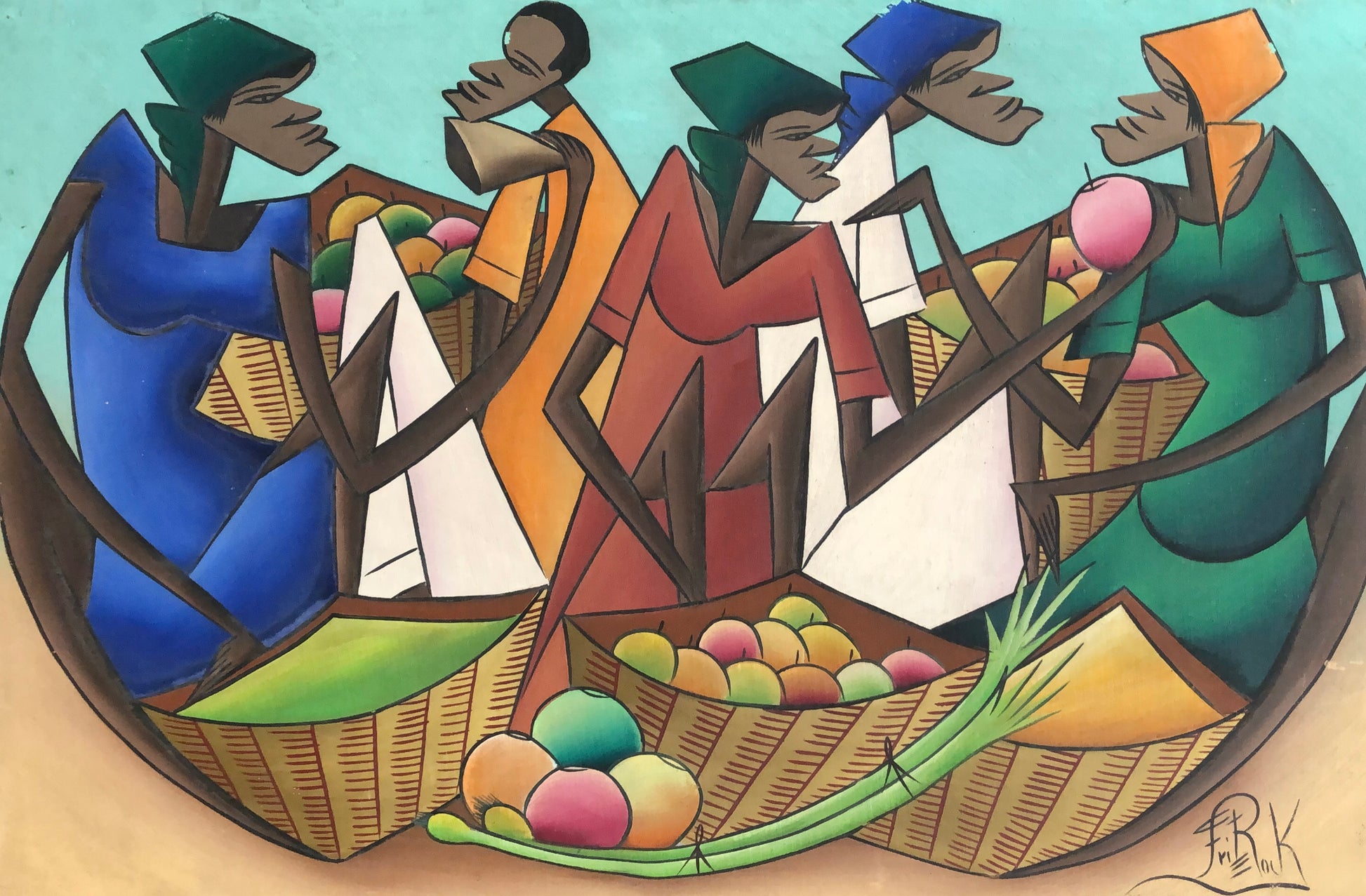 This dynamic oil painting by Haitian artist Fritz Rock captures the rhythm and energy of a bustling market scene. Rendered in his signature geometric and modernist style, the composition features elongated figures with angular limbs, gathered around baskets overflowing with tropical fruits. Rock’s bold lines and vibrant color palette—rich blues, oranges, and greens—convey both harmony and movement, reflecting the artist’s mastery at blending Cubist influences with Haitian everyday life.