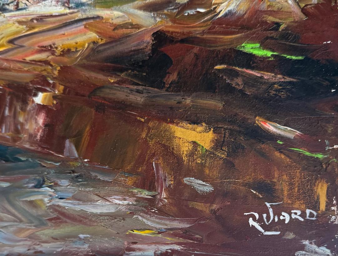 This is a vintage, colorful 36"x48" landscape painting featuring trees, rocks, and a path, signed by the well-known Haitian artist Raoul Viard. The painting is in good condition and is sold unframed. It was initially purchased directly from the artist and now belongs to a private collector in New Rochelle, NY, where it will be shipped. Our gallery will issue a certificate of authenticity upon purchase.
