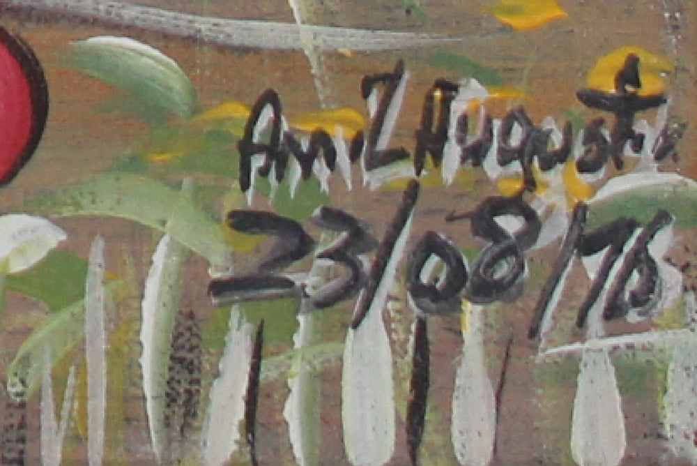 This charming rural scene by Jean Amil Augustin depicts villagers gathering fruits among colorful houses and flowering trees. Signed and dated (23/09/16), it was painted in Switzerland and remains in very good condition. The work is sold unframed, from a private Swiss collection, and will be shipped with a Certificate of Authenticity issued by our gallery.