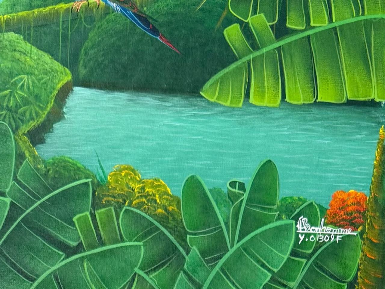 Self-taught artist Albott Bonhomme, born in 1963 in Port-de-Paix, Haiti, has established himself as a prominent figure in the art world since becoming a professional artist in 1990. His striking paintings of birds set against lush oasis environments capture the viewer's attention and ignite appreciation. Bonhomme's work has made its mark globally, with a strong following among collectors in the United States and Japan. As noted in "Peintres Haitiens" by Gerald Alexis (Editions Cercle d'Art, 2000), his "tropical forest scenes powerfully illustrate the environmental challenges facing Haiti." Don't hesitate to scroll down and explore his remarkable creations!