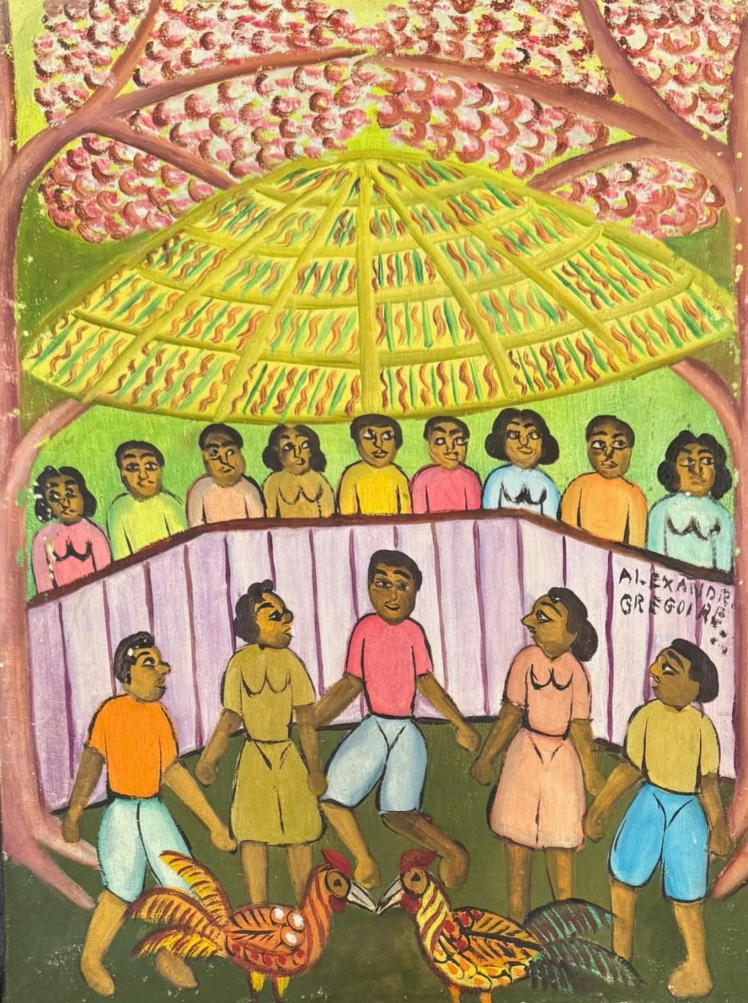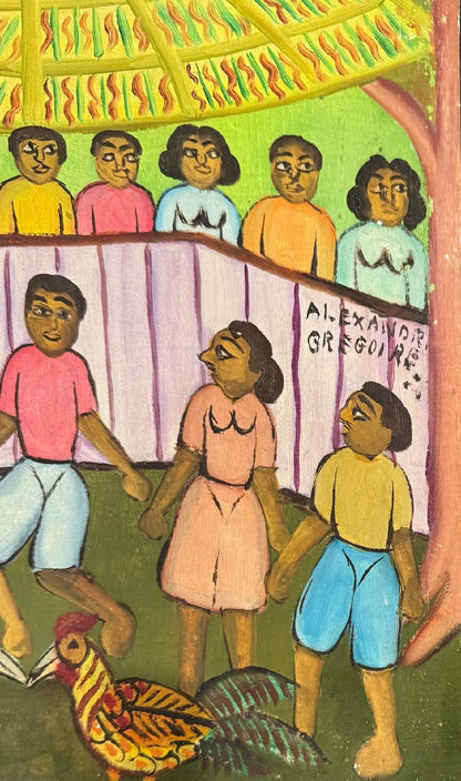 Acquire this exceptional original artwork signed by the renowned Haitian naive artist Alexandre Gregoire, dated 1970. This striking 16"x12" oil on canvas captures a dynamic cockfighting scene in Haiti. Despite some scratches, this piece is sold as-is and unframed. Don't miss the chance to own a unique piece of art history!