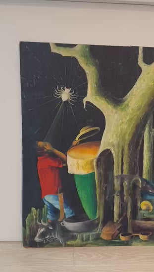 This remarkable original oil painting, measuring 30"x24", is crafted by the renowned late Haitian master painter, Celestin Faustin. It offers a captivating depiction of an occult vision featuring a spider and a man—an essential addition to your art collection! Currently held by a private collector in Canada, this artwork will be promptly shipped to you upon purchase. Our gallery will provide a certificate of authenticity to confirm its value.