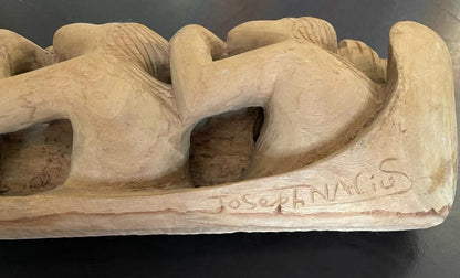 Nacius Joseph, the fine Haitian sculptor, hand-carved this wood mahogany sculpture of six boat people rowing the boat. It is in good condition and signed 'Joseph Nacius" on the side.