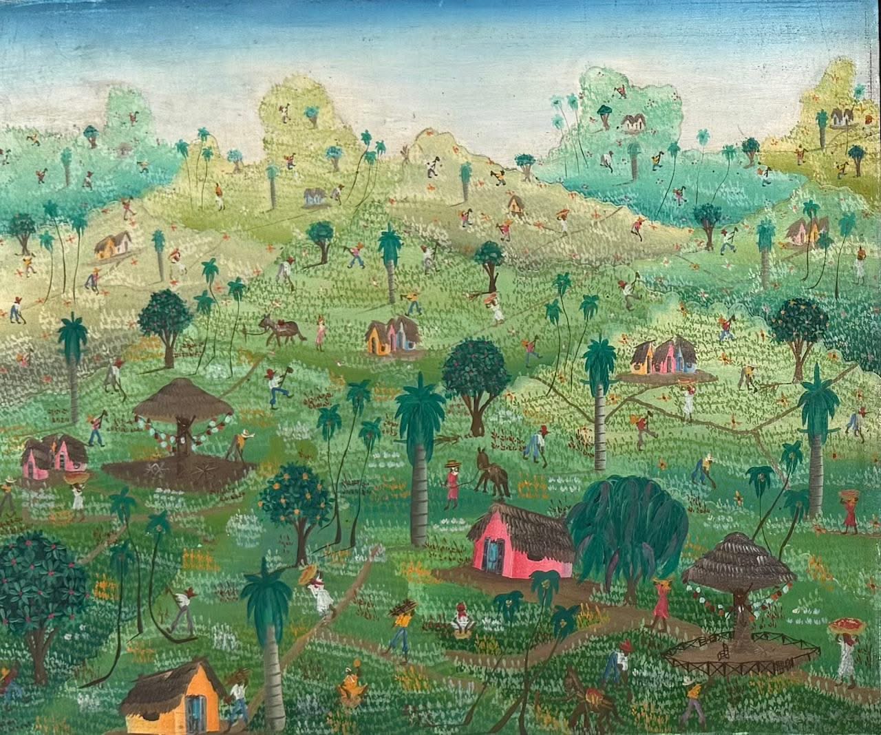 BUY NOW this primitive painting signed by the Haitian artist John Adeler Pierre. This painting represents a rural scene. It is an original oil on canvas and dated circa 1980.