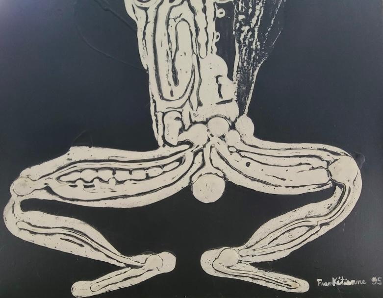The late renowned Haitian master Franck Étienne, also known as Frankétienne, created this stunning statement piece titled "Je suis la Beauté" (I am beauty). The painting features drips and bubbles of paint reminiscent of Jackson Pollock's style, and the depiction of bones adds a sense of depth. The artwork is in good condition and comes from a collector in Wilton, CT, where it will be shipped from. Our gallery will issue a certificate of authenticity upon purchase.