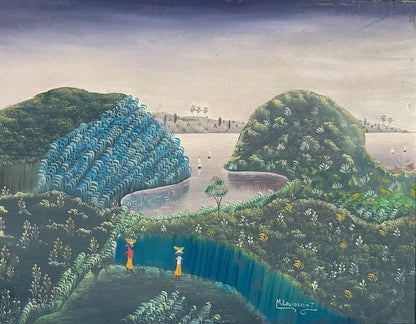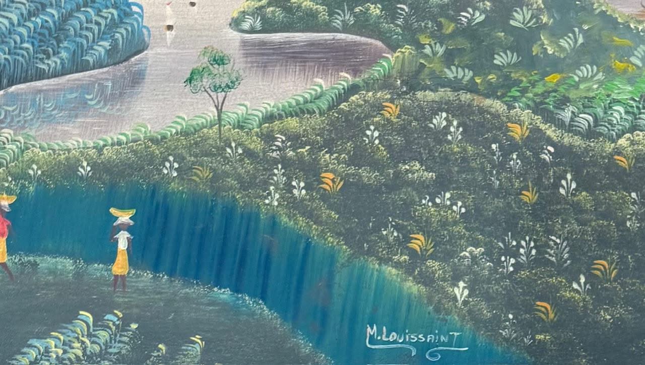 BUY NOW this primitive painting signed by the Haitian artist Michel Louissaint. This painting represents a landscape scene. It is an original oil on canvas and dated circa 1980.