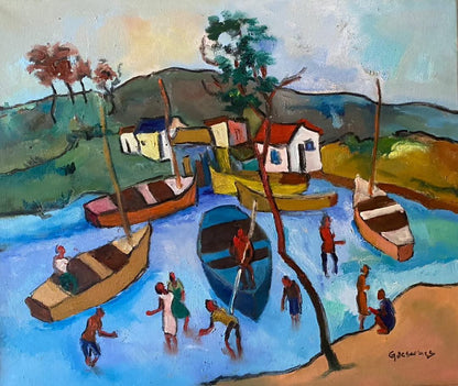 Georges Desarmes, the renowned Haitian painter, signed this beautiful original 9"x12" oil on canvas of four coastal boats scene painted with people and mountains. It is in good condition, signed in the lower right corner, and sold unstretched and unframed.