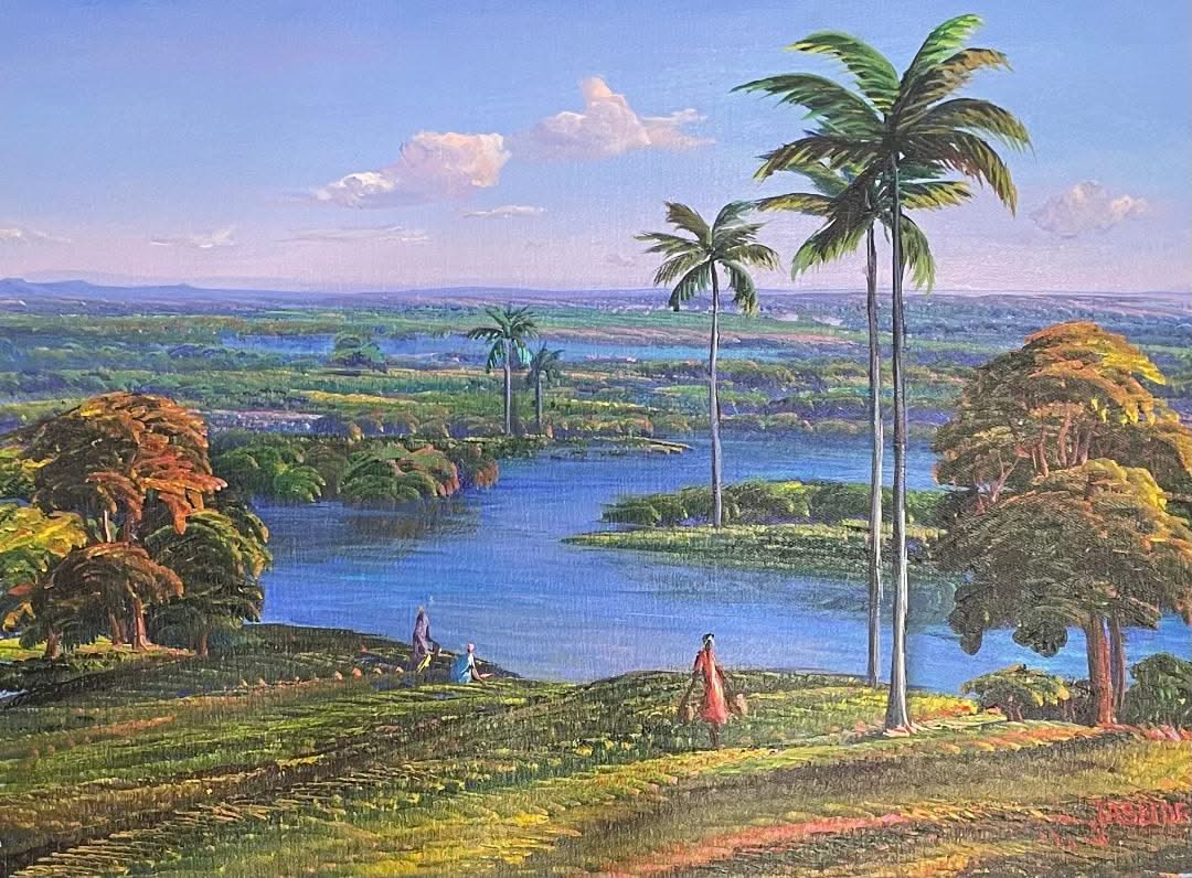 Well-known Haitian painter Jean Adrien Seide painted this unique and beautiful small landscape painting that adds to any decor! It is a 12"x16" painting acrylic on canvas depicting a landscape view of women walking by the river, and it is sold unstretched and unframed.