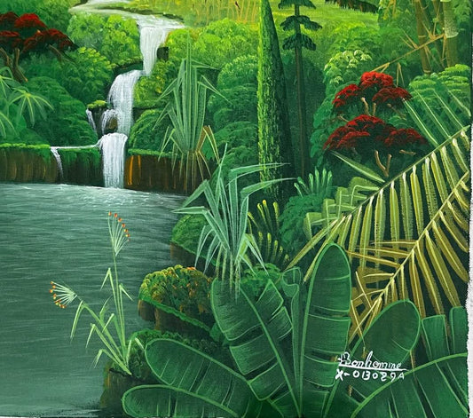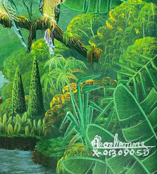 Albott Bonhomme 20"x24" Lush Tropical Forest with Birds, Cactus & Cascade 2022 Acrylic on Canvas Painting #33MFN
