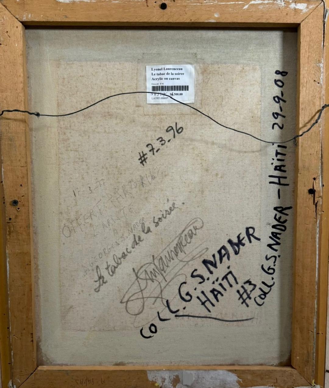 Lyonel Laurenceau, the acclaimed Haitian master, confidently signed and titled this remarkable painting "Le Tabac de La Soirée" in the lower right corner in 1974. It has a tiny hole. This exceptional piece is part of a private collection in Florida and will be shipped directly upon purchase. Our gallery guarantees a certificate of authenticity with every transaction.