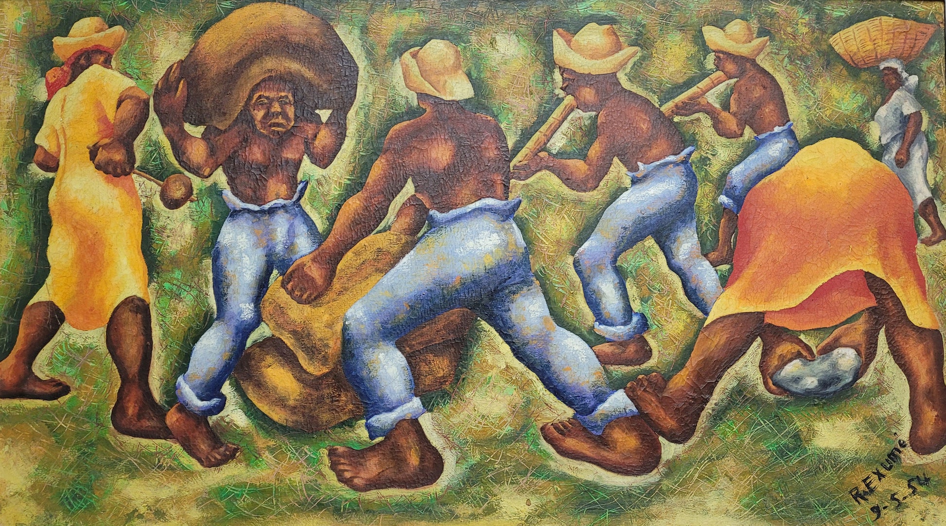 The Haitian artist Rene Exume signed this original artistic depiction of workers carrying loads on a green background. It is from the private collection in new Rochelle, New York, where the artwork will be shipped unframed. Our gallery will issue a certificate of authenticity upon purchase.