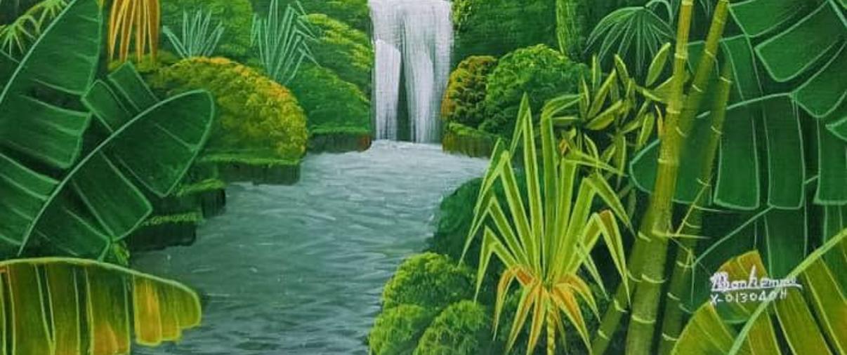 This is an original painting by the renowned Haitian artist Albott Bonhomme. It portrays a vibrant tropical rainforest scene with birds and a waterfall.The artwork is sold unframed and is signed in the lower right corner, featuring the inscription X013040H. Our gallery will provide a certificate of authenticity upon purchase.