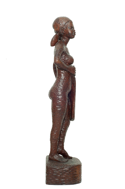 Ludovic Booz (1940-2015) 33"x7"x6'' Woman & Bag Hand-Carved in Mahogany Wood Sculpture #8-3-11GSN- Fondation Marie & Georges S. Nader