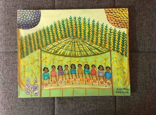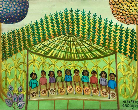 Alexandre Grégoire nació en Jacmel, Haití el 29 de agosto de 1922 y murió en 2001. Por lo general, representó las escenas de Vodou, la vida cotidiana y los eventos históricos en un estilo ingenuo. Grégoire fue educado de 1930 a 1937 por los Christian Teaching Brothers y luego estudió ebanistería en la escuela vocacional Jacmel durante dos años. En 1939 se unió al ejército y tocó la tuba y el saxofón en la banda del ejército. Permaneció en el ejército hasta la década de 1950; durante la presidencia de Paul Magloire, dejó el ejército y se unió a la banda del Palacio Nacional. En 1968, animado por sus amigos Préfète Duffaut y Pierre-Joseph Valcin y el Centre d'Art de Port-au-Prince, Grégoire comenzó a pintar. ¡Desplácese hacia abajo para hacer su(s) selección(es)!