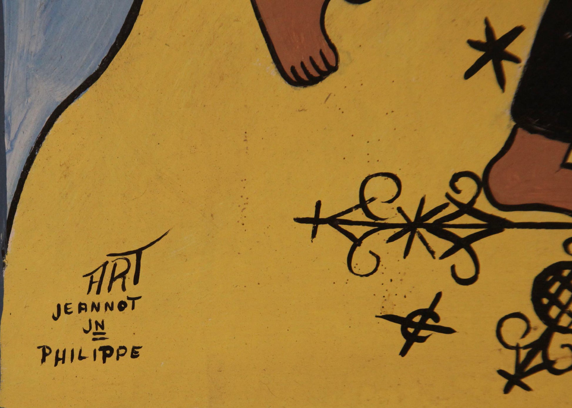 Haitian artist Jeannot Jean-Philippe, born in Haiti in 1958 and deceased in 1997, is recognized for his compelling works that depict Vodou scenes. He had a significant exhibition titled "In Extremis" at the Fowler Museum at UCLA in Los Angeles, California, in 2012. While he did not conduct solo exhibitions, he made a noteworthy appearance in a group exhibition alongside prominent artists Leah Gordon and Yves Telemak. Jeannot's artwork is rare and highly sought after, particularly among collectors like the late American producer Jonathan Demme.