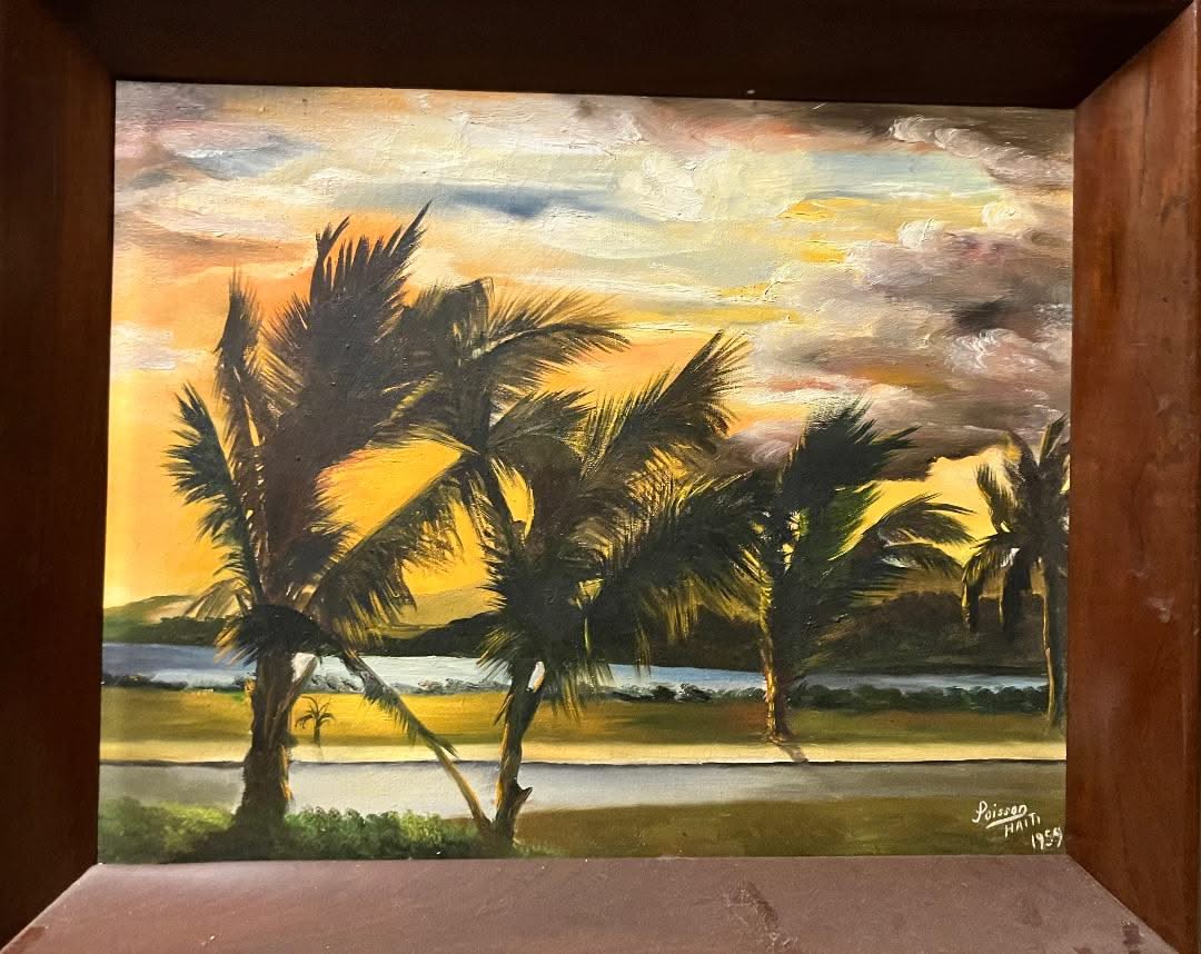 Louverture Poisson (1914-1985) 15"x19.5" Haiti Sunset By The Beach 1959 Oil on Canvas Painting #2AT