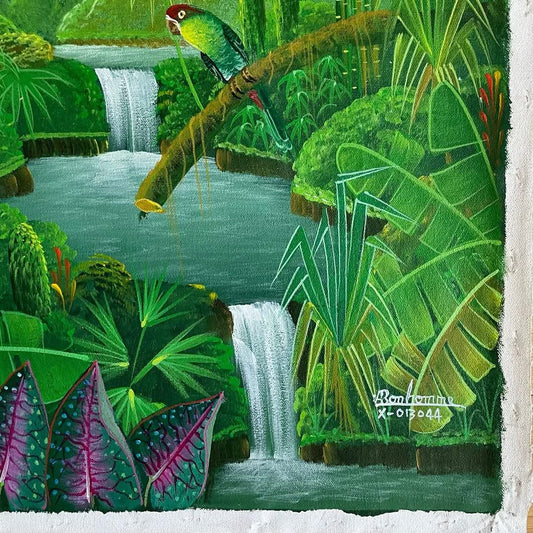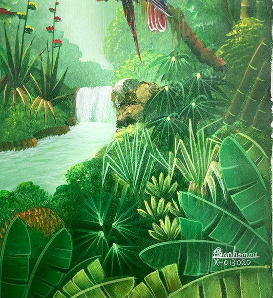Albott Bonhomme 24"x20" Trois oiseaux dans la jungle tropicale avec cascade et arbres 2022 Acrylique sur toile Peinture #31MFN