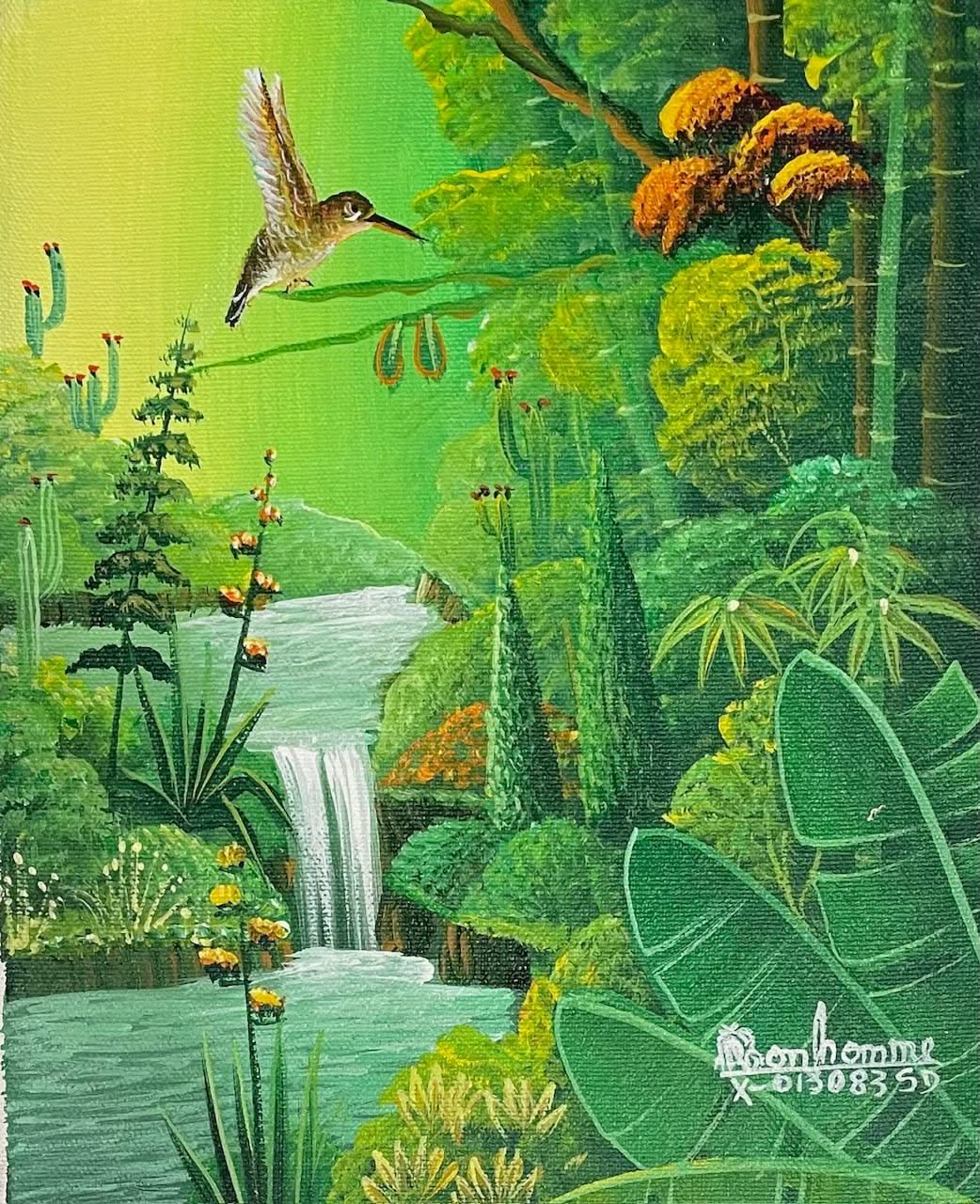 Self-taught artist Albott Bonhomme was born in 1963 in Port-de-Paix, Haiti. He became a professional artist in 1990 and painted birds in a lush oasis. He has been exhibited worldwide, and his art is appreciated by many collectors internationally, mainly in the US and Japan. His "Tropical forest scenes evoke the environmental problems confronting Haiti" (Peintres Haitiens by Gerald Alexis, Editions Cercle d'Art, 2000)