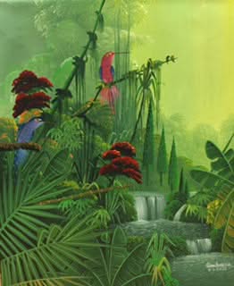 ACHETEZ MAINTENANT cette peinture originale de scène de forêt tropicale du célèbre artiste haïtien Albott Bonhomme. Ce tableau représente un paradis tropical avec un oiseau rouge aux ailes bleues dans une végétation luxuriante. Il s'agit d'une acrylique originale sur toile, datée de 2014, et signée en bas à droite, avec l'inscription en dessous T-013076.