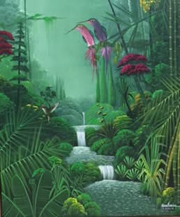 ACHETEZ MAINTENANT cette peinture originale de scène de forêt tropicale du célèbre artiste haïtien Albott Bonhomme. Ce tableau représente un paradis tropical dans une végétation luxuriante avec des oiseaux. Il s'agit d'une acrylique originale sur toile, datée de 2014, et signée en bas à droite, avec l'inscription en dessous T-013074.