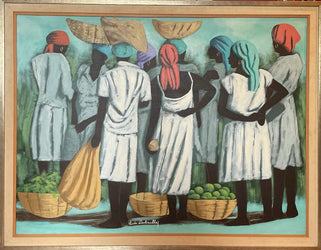 Claude Dambreville a signé ce magnifique tableau immense. Il représente une scène figurative d'un bon jour de marché dans les rues d'Haïti. Il s'agit d'une acrylique sur toile en bon état et vendue sans cadre.