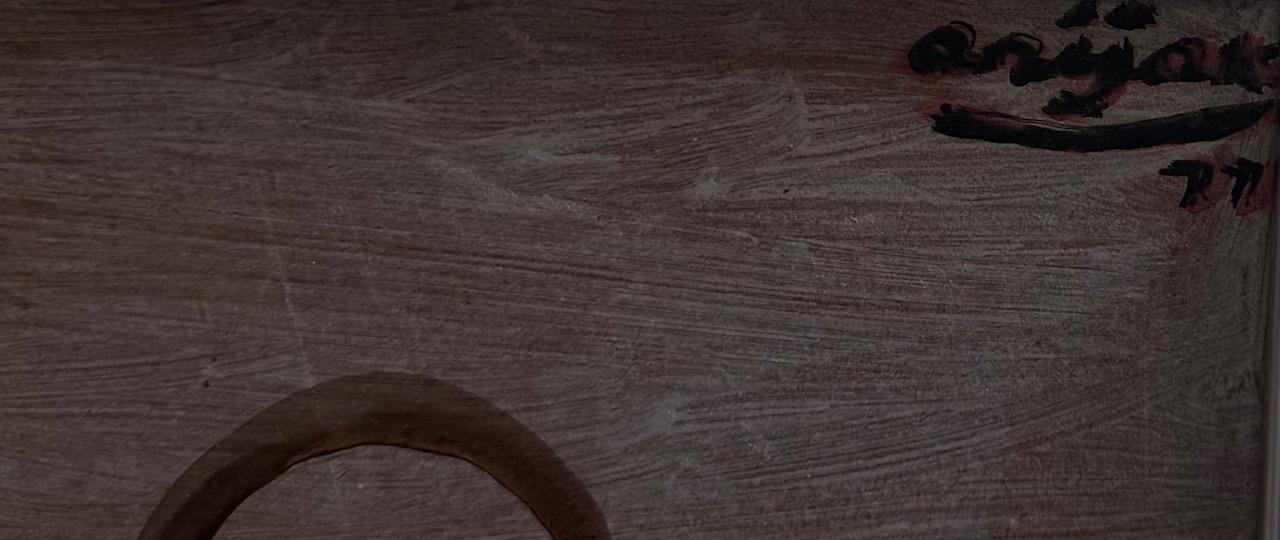 Arijak, Nudes, 1977, acrylic on board, 16"x 20". This abstract figural composition reduces the human form to flowing, organic contours set against bold red and natural tones, with a circular sun-like motif anchoring the space. The work is in good condition, sold unframed, from a private collection in New York, where it will be shipped. A certificate of authenticity will be issued upon purchase.