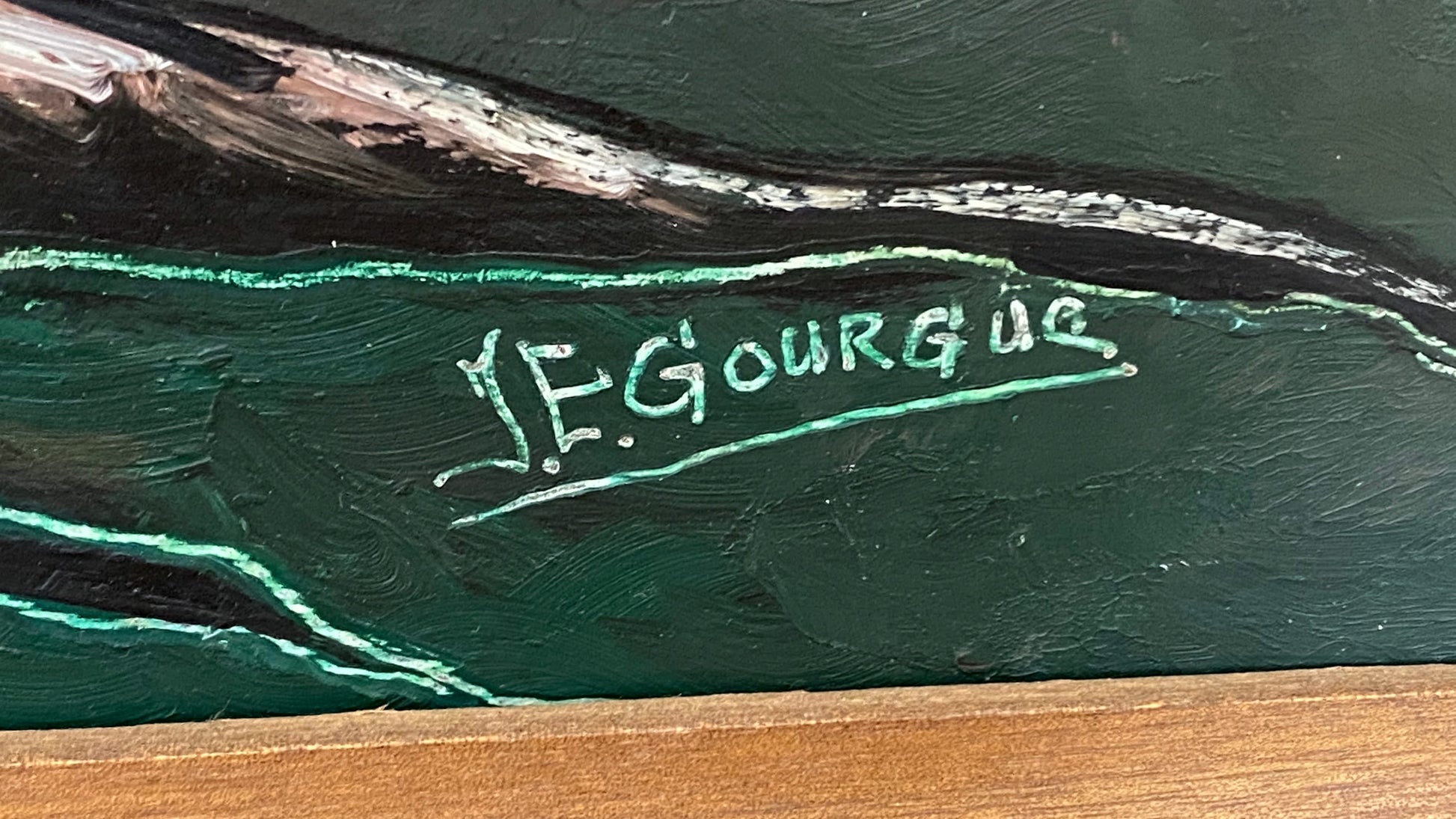 JE Gourgue peignait généralement des scènes de la vie rurale haïtienne et des cérémonies vodou . Gourgue, qui n'avait aucune formation formelle, combinait souvent fleurs, montagnes, arbres squelettiques, paysans et leurs huttes et symbolisme vaudou dans un style personnel mêlant surréalisme et art naïf. "Il est incontestablement la figure marquante de la peinture haïtienne moderne."