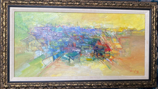 Jacques Valbrun (Haïtien, 1938-1992) 15"x25" Maisons abstraites Acrylique sur toile Peinture #1TC
