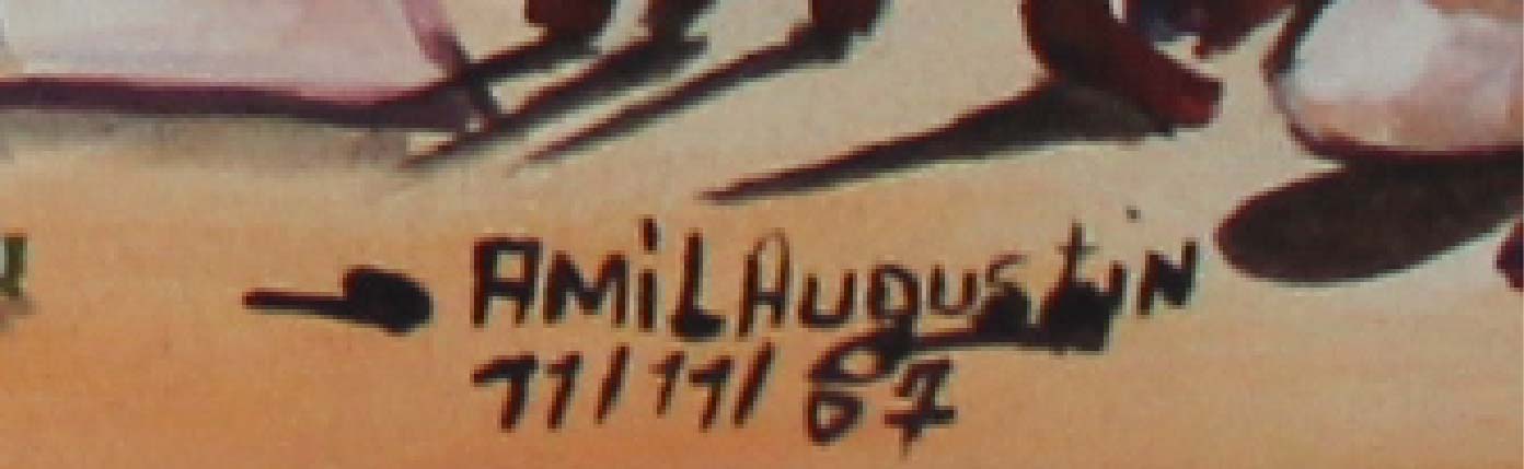 “Marché Haïtien” (Haitian Market): This lively painting by Jean Amil Augustin, created during his time in Switzerland, depicts a bustling Haitian market centered around a blue truck marked “Haïti.” Villagers engage in daily life—trading goods, carrying baskets, and gathering together—against a backdrop of colorful houses and makeshift stalls. Signed and dated lower right (11/11/07), the painting is in very good condition with stable pigments and no visible damages. From a private Swiss collection, it will be shipped unframed from Switzerland with a Certificate of Authenticity issued by our gallery.