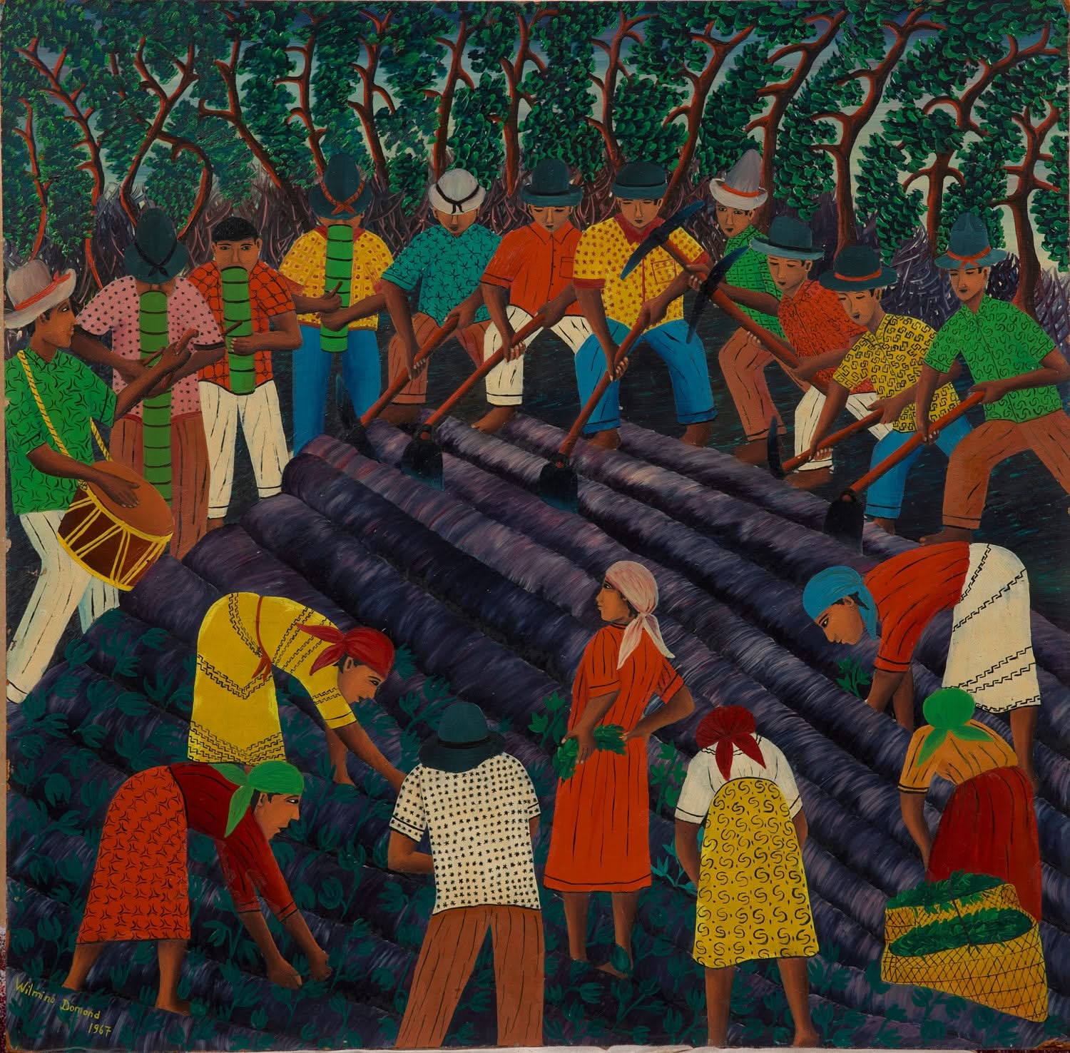 Wilmino Domond (1925-2006) 23,5"x23,75" Les moissonneurs 1967 Peinture à l'huile sur carton sans cadre #1PS
