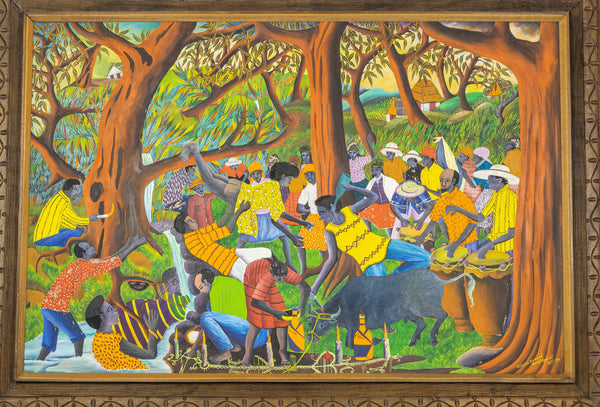 Wilmino Domond (1925-2006) 32"x47.25" Bois Caiman Voodoo Ceremony 1973 Huile sur carton Peinture encadrée #19SS