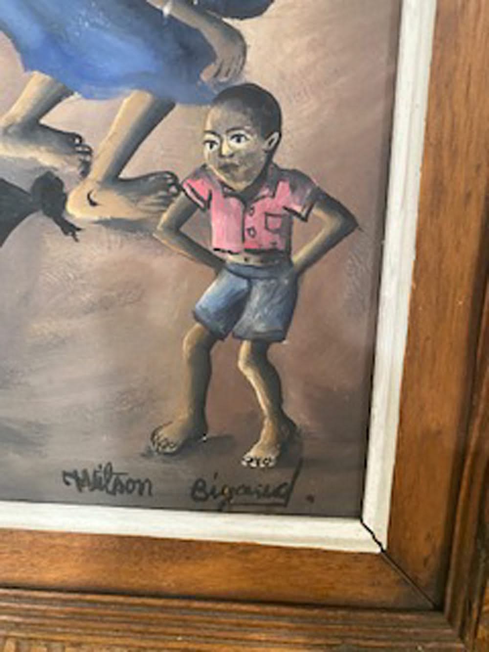 Wilson Bigaud est considéré comme l'un des grands maîtres de l'art haïtien. Né en 1931, il commence à peindre sous la direction du célèbre pionnier haïtien Hector Hyppolite alors qu'il n'a que quinze ans. Une lumière dorée et des couleurs chaudes caractérisent ses premières œuvres. Il peignait des tableaux merveilleux et humoristiques dans la relative solitude de Petit Goâve. Bigaud est représenté dans la collection permanente du Museum of Modern Art de New York et dans d'importantes galeries d'art en Haïti et à l'étranger. Il est décédé en 2010. Wilson Bigaud "..utilise un sens inné des effets de couleurs pour modeler diverses formes. À la fin des années 1950, de nombreuses dépressions ruinent son style." Peintres Haïtiens par Gérald Alexis. Obtenez le livre maintenant !