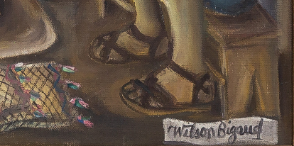 Wilson Bigaud est considéré comme l'un des grands maîtres de l'art haïtien. Né en 1931, il commence à peindre sous la direction du célèbre pionnier haïtien Hector Hyppolite alors qu'il n'a que quinze ans. Une lumière dorée et des couleurs chaudes caractérisent ses premières œuvres. Il peignait des tableaux merveilleux et humoristiques dans la relative solitude de Petit Goâve. Bigaud est représenté dans la collection permanente du Museum of Modern Art de New York et dans d'importantes galeries d'art en Haïti et à l'étranger. Il est décédé en 2010. Wilson Bigaud "..utilise un sens inné des effets de couleurs pour modeler diverses formes. À la fin des années 1950, de nombreuses dépressions ruinent son style." Peintres Haïtiens par Gérald Alexis. Obtenez le livre maintenant !