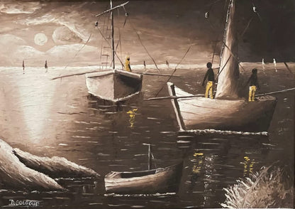 "Sailors At Night" is an original vintage painting 12"x16" signed by Haitian artist Decourcelle Gourgue.