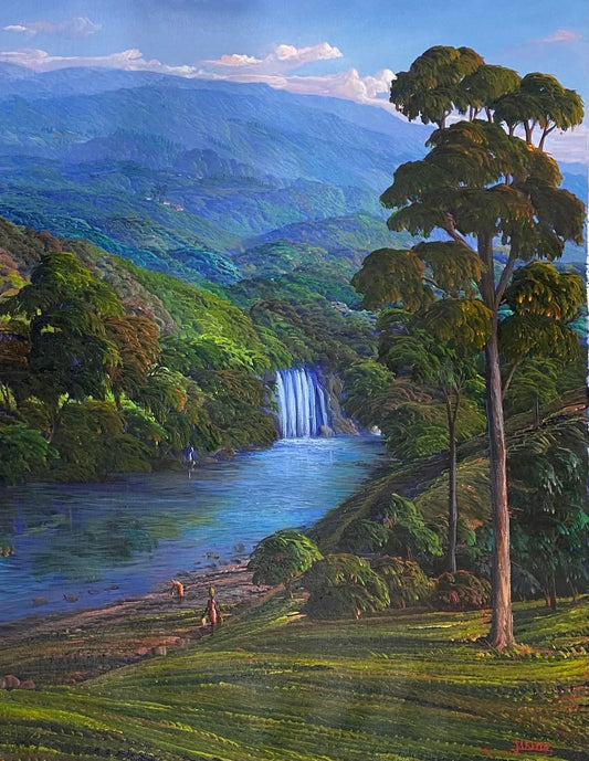 Jean Adrien Seide's themes derive from the River of Artibonite, the mountains of Jacmel, and the cascades from the famous Saut Mathurin or Peligre in Haiti. At first glance, his paintings look representational, but a more detailed examination leads to a fascination, and the fantastic element predominates over the immediate reality.