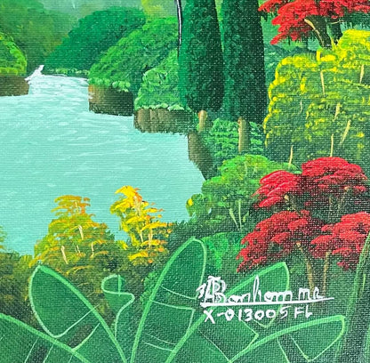 Albott Bonhomme painted this original 8"x10" contemporary painting of a tropical paradise with a woodpecker and a parrot in lush vegetation. It is an original canvas acrylic painting, signed on the lower right side, with the inscription X-013005FL below the signature. It sold stretched and unframed and will be shipped from New York.