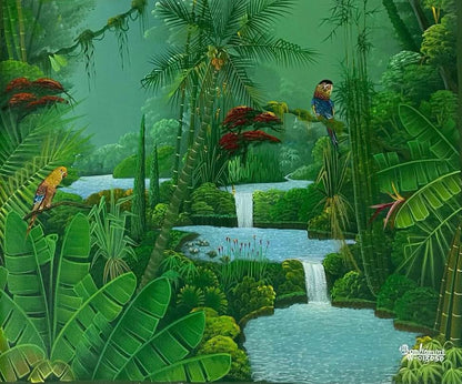 This stunning tropical forest scene with birds and cascades is an original painting by the Haitian renowned artist Albott Bonhomme. It is an original acrylic on canvas, dated 2021, and signed on the lower right side, with the inscription below W-01350.