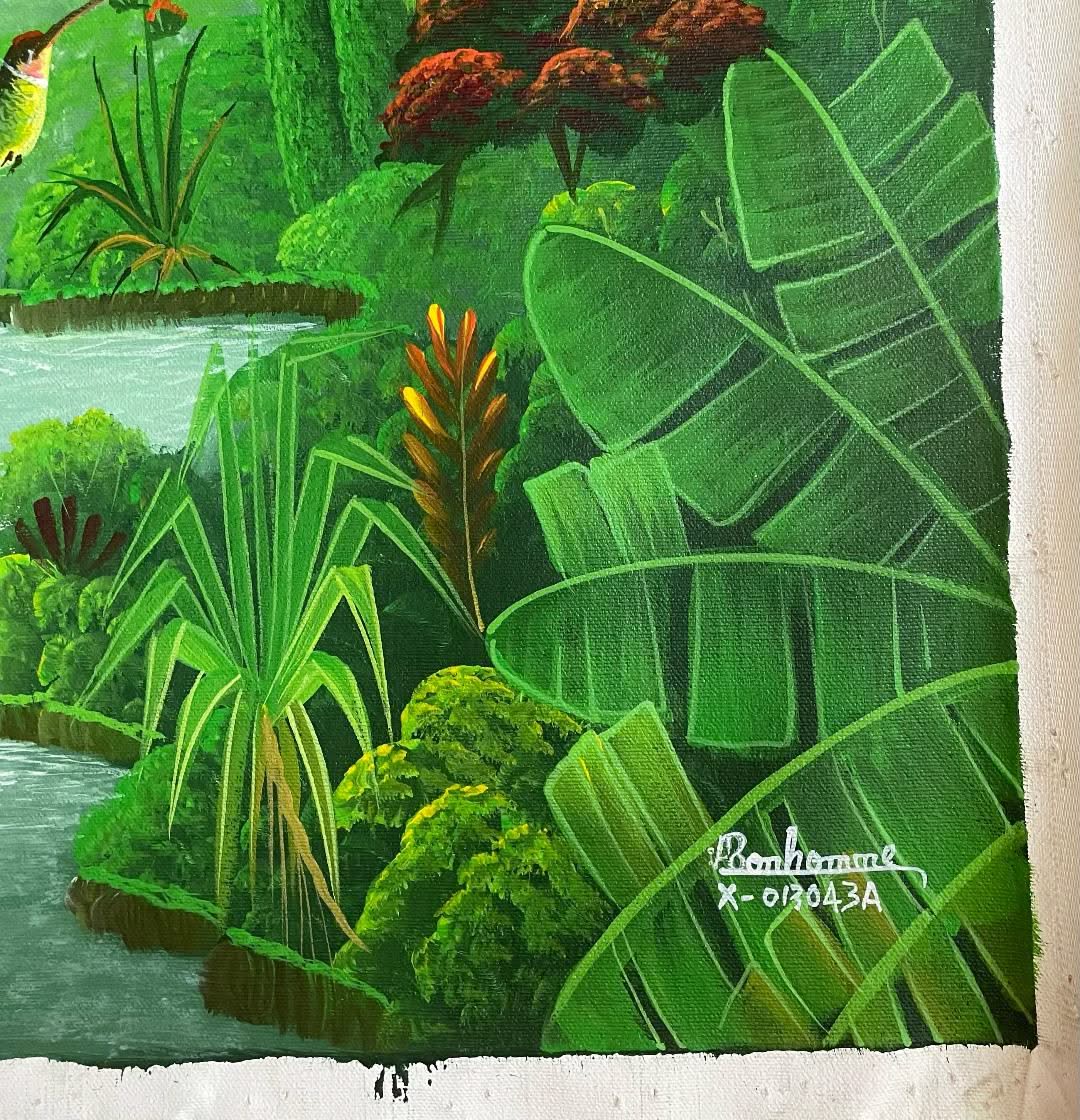 What a beautiful tropical paradise painting by the renowned Haitian artist Albott Bonhomme to add to your collection! This painting represents a tropical paradise where a perching bird is watching a bird flying above a cascade in lush vegetation. It is an original canvas acrylic, signed on the lower right side, with the inscription below X-013043A.