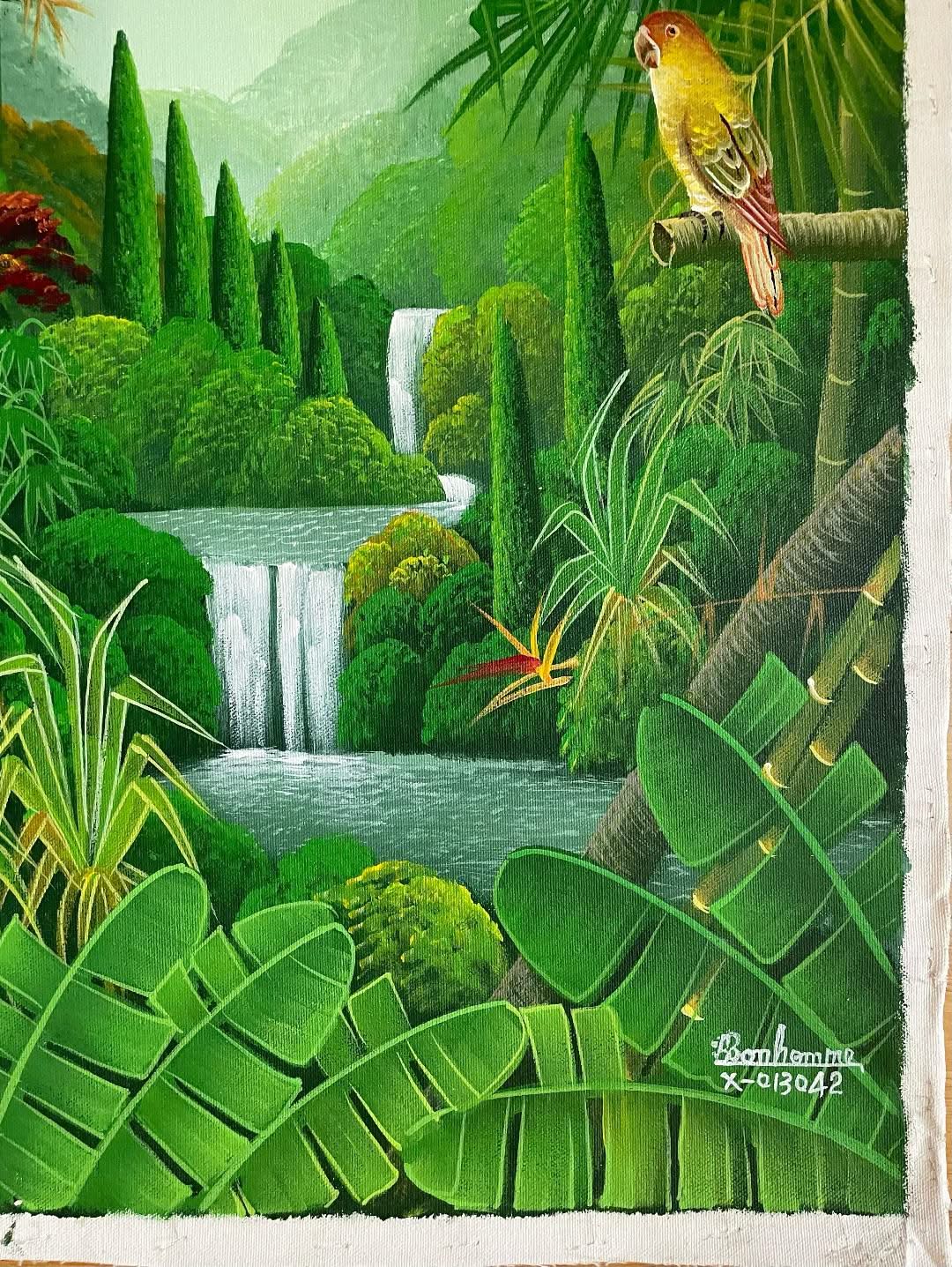 Albott Bonhomme was born in 1963 in Port-de Paix, Haiti. He is a self-taught artist who has developed a unique style depicting colorful birds in lush vegetation and the misty atmosphere of his imaginative tropical jungles n Haiti. He uses various tones of greens, and the birds are presented in vibrant colors. Albott Bonhomme is cited in major Haitian books, and he has exhibited in Haiti, the US, and Japan.