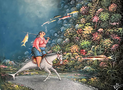 Andre Blaise 12"x16" Fish On A Horse Acrylic on Canvas Unframed Painting#6MFN