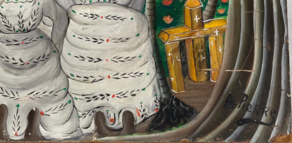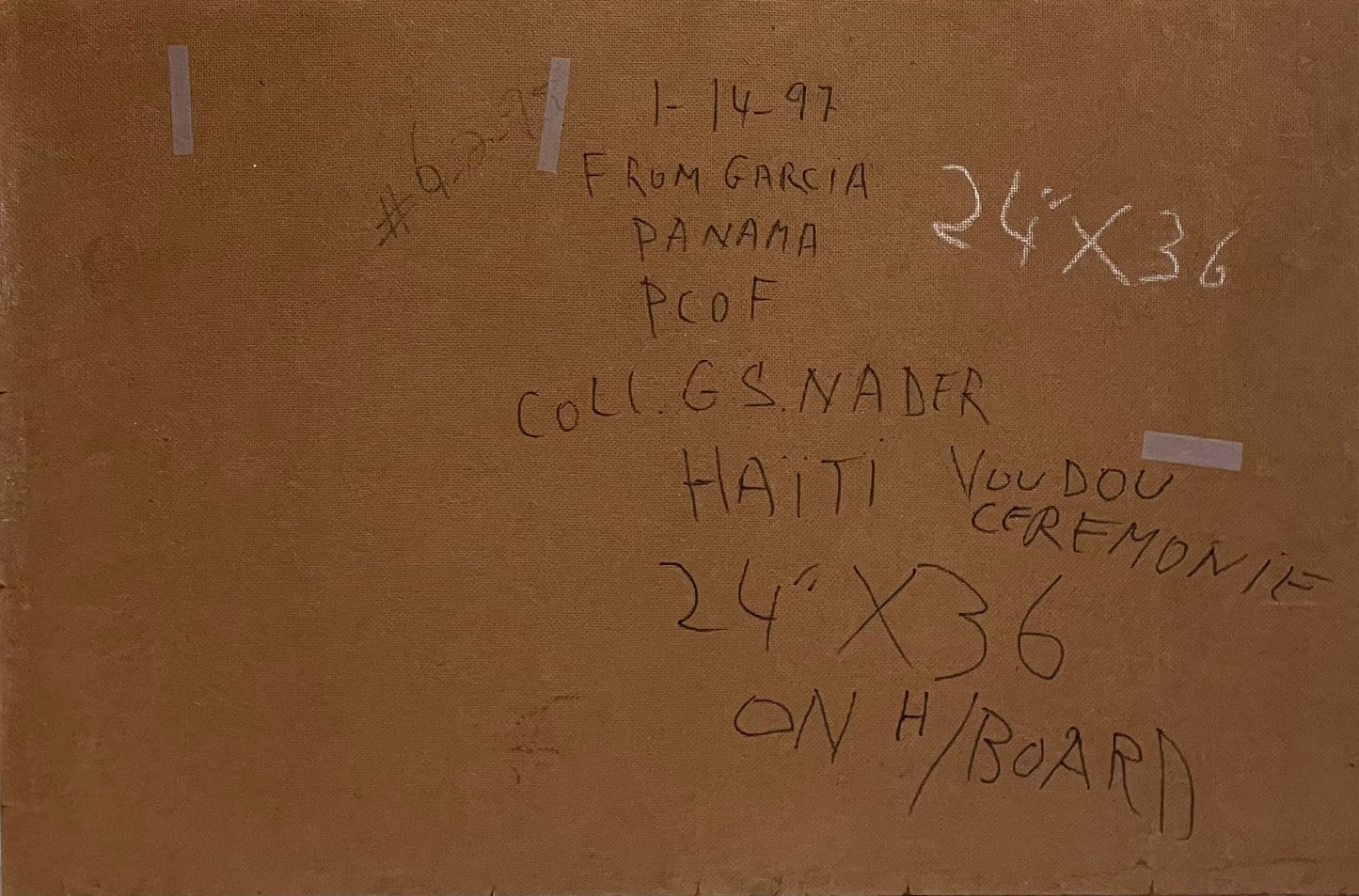 An unframed 24"x36" oil on board painting of a voodoo ceremony signed by the famous Haitian artist Andre Pierre to add to your art collection. The upper and lower right corners are missing but can't be easily hidden under a frame. It belongs to the private art collection of Georges S. Nader in New York.