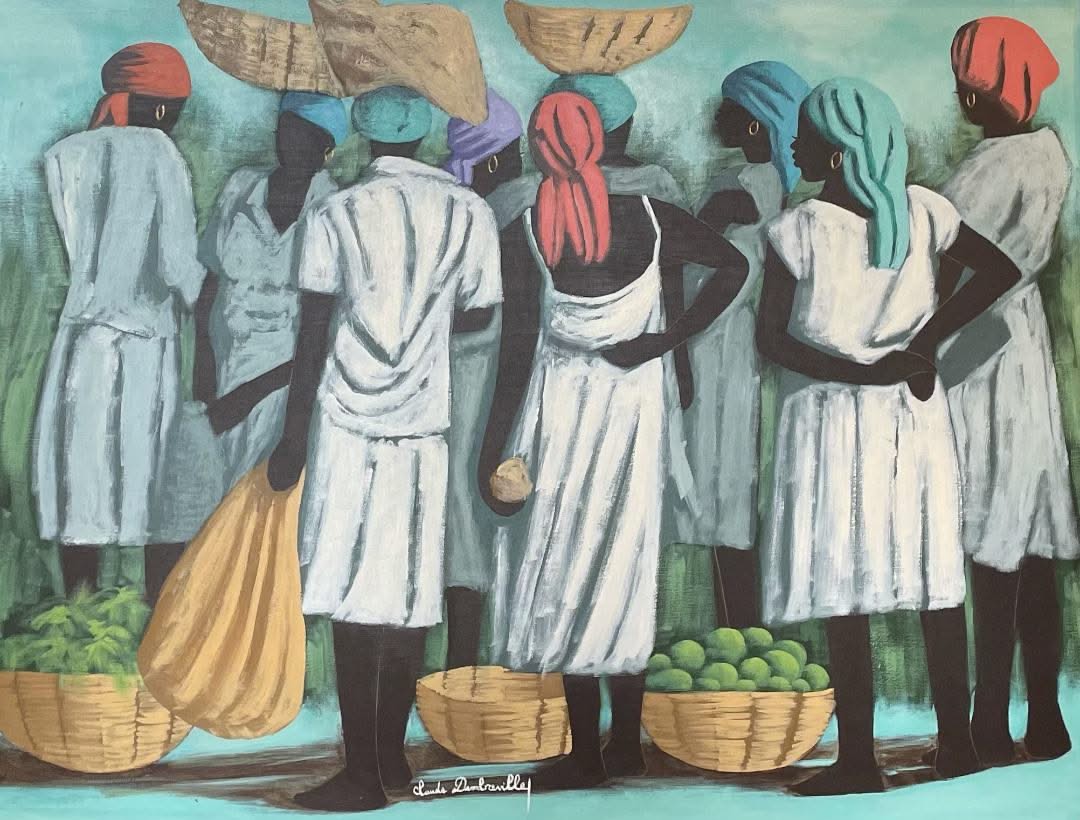 Claude Dambreville signed this beautiful huge painting. It depicts a figurative scene of a good market day on the streets of Haiti. It is an acrylic on canvas in good condition and sold unframed.