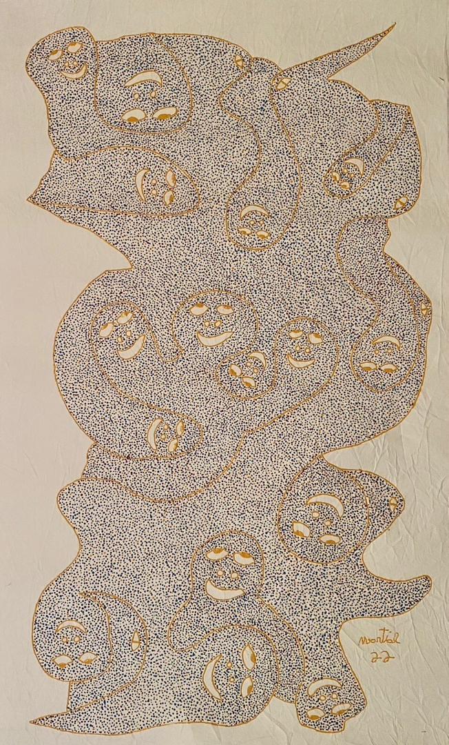 This acrylic on canvas by Haitian artist Edouard Martial (b. 1978) was completed in 2022. The work features a flowing organic form filled with smiling faces, outlined in warm gold against a soft cream background. Hundreds of delicate dotted marks create a lively texture, giving the impression of movement, laughter, and communal harmony. Martial’s distinctive pointillist technique transforms simple outlines into vibrant, animated clusters of expression. The composition radiates warmth and optimism, evoking themes of joy, togetherness, and the spiritual energy of community. The artwork is in excellent condition and will be sold unframed.