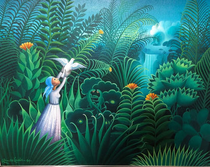 Eric Jean-Louis (1957–2022) masterfully evokes Haitian poetic symbolism in Freeing the Dove, a luminous oil on canvas that immerses the viewer in a dense tropical sanctuary of layered greens, flowering plants, and misted waterfalls. At the heart of the composition, a graceful figure in white releases a dove into the air—a quiet, uplifting gesture that reads as freedom, hope, and spiritual renewal. Jean-Louis’s signature depth, crisp detailing, and velvety color transitions create a striking visual experience that instantly elevates a room, making this work an exceptional focal point for collectors seeking a refined, museum-worthy example of modern Haitian painting. This artwork comes from the private collection of Georges S. Nader in New York and will be shipped directly from the collection. It is offered for sale as-is in good condition. A Certificate of Authenticity will be issued by Myriam Nader Haitian Art Gallery upon purchase.