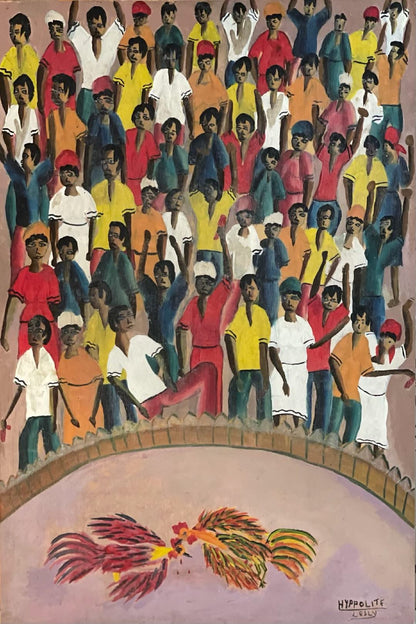 This is an original vintage painting by Hyppolite Lesly, a Haitian primitive painter who paints cockfights in the Casimir Laurent's style. It is sold unframed.