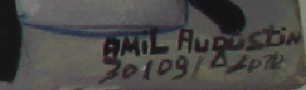 This elongated monochromatic composition by Jean Amil Augustin shows a rhythmic line of Haitian women balancing goods and baskets on their heads. Color accents punctuate the grayscale harmony. Signed and dated (30/09/12), the work is in very good condition, created in Switzerland, and is sold unframed. It comes from a private Swiss collection and will be shipped with a Certificate of Authenticity issued by our gallery.