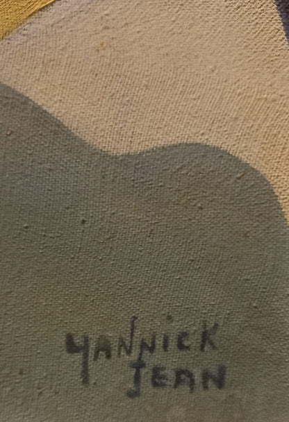 The Haitian female painter, Yannick Jean, signed this unique 24"x36" painting of a colorful abstract /figurative scene. It is sold in fair condition (water spots) from the collection of a private collector from Florida. The price has been reduced due to its condition. As you can see, there are different sized spots on the left side of the painting. The owner had it evaluated by a reputable restauring specialist who says that it can be repaired for an amount of approximately $950. Our gallery will provide a certificate of authenticity upon purchase.
